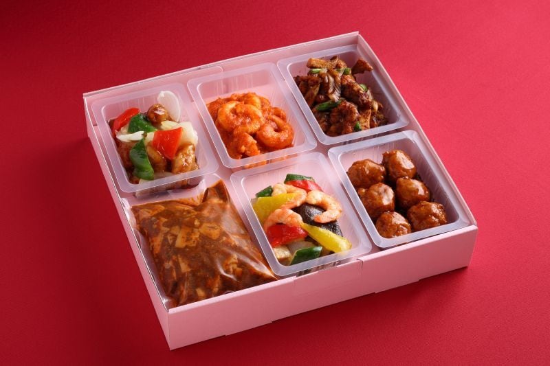電子レンジで加熱:酢豚・肉団子・海の幸XO醤炒め・牛肉と舞茸の炒め・鶏肉の甘味噌炒め