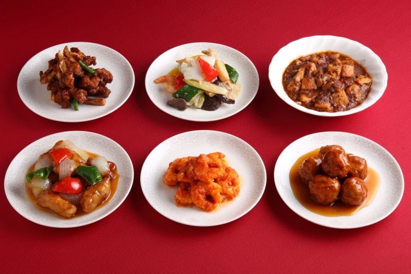 ①酢豚②肉団子の甘酢あんかけ③海老のチリソース煮④陳麻婆豆腐